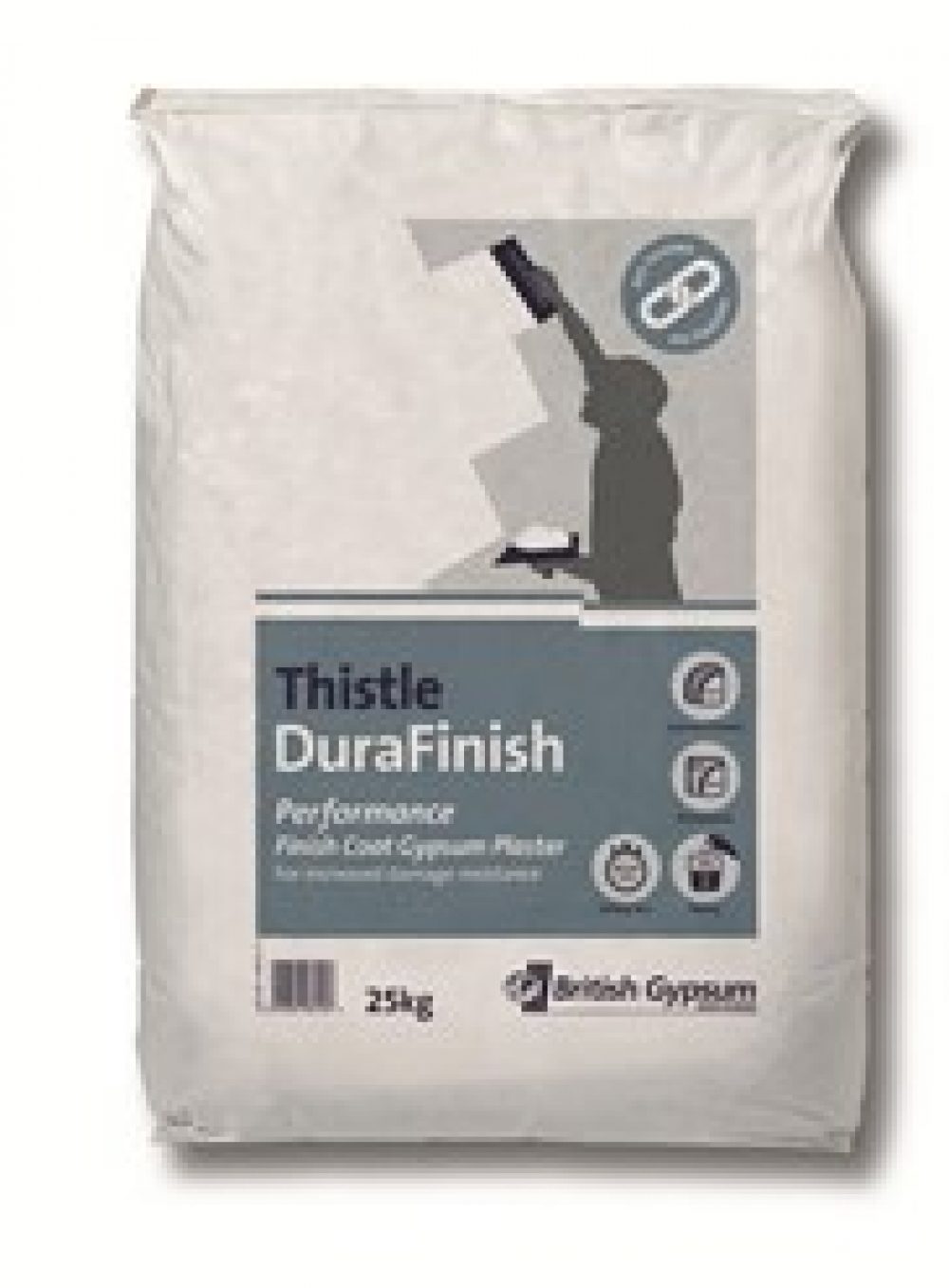 Thistle DuraFinish is a gypsum finish plaster specially formulated for increased resistance to accidental damage. It enables significantly longer maintenance intervals and lower long-term cost in heavy traffic areas of many types of buildings. It may be used on a wide range of backgrounds, including most undercoat plasters, and to enhance the surface damage resistance of any British Gypsum partition or wall lining system. It is particularly suited for GypWall EXTREME and GypWall ROBUST. Thistle DuraFinish is a gypsum finish plaster for use on a wide range of backgrounds. It provides a smooth, inert, high quality surface to internal walls and ceilings, and a durable base for the application of decorative finishes. Thistle DuraFinish is retarded hemihydrate, pre-mixed gypsum plaster, requiring only the addition of clean water to prepare it for use. This finish plaster is one of our products within our plasters range that is certified to BES 6001, achieving a rating of Excellent.