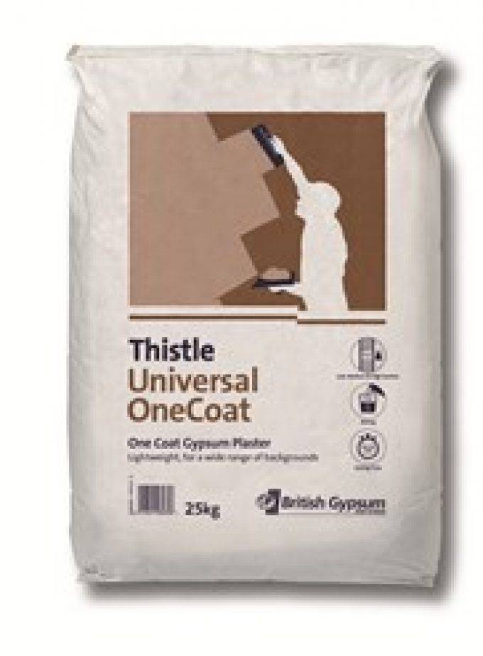 Thistle Universal OneCoat is a gypsum-based plaster, suitable for hand or machine application to most internal backgrounds, and is characterised by its white appearance and good impact strength. It is gypsum hemihydrate formulated with special additives to control working and setting characteristics. It includes lightweight aggregate to improve the plasters handling, workability and application, and dries to provide a white, smooth, matt finish. This plaster is one of our products within our plasters range that is certified to BES 6001, achieving a rating of Excellent.
