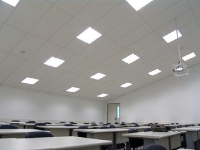 Isover glass wool acoustical ceiling with micro perforated vynil facing installed with grid systems. Also used as thermal insulation. Safe in case of fire.